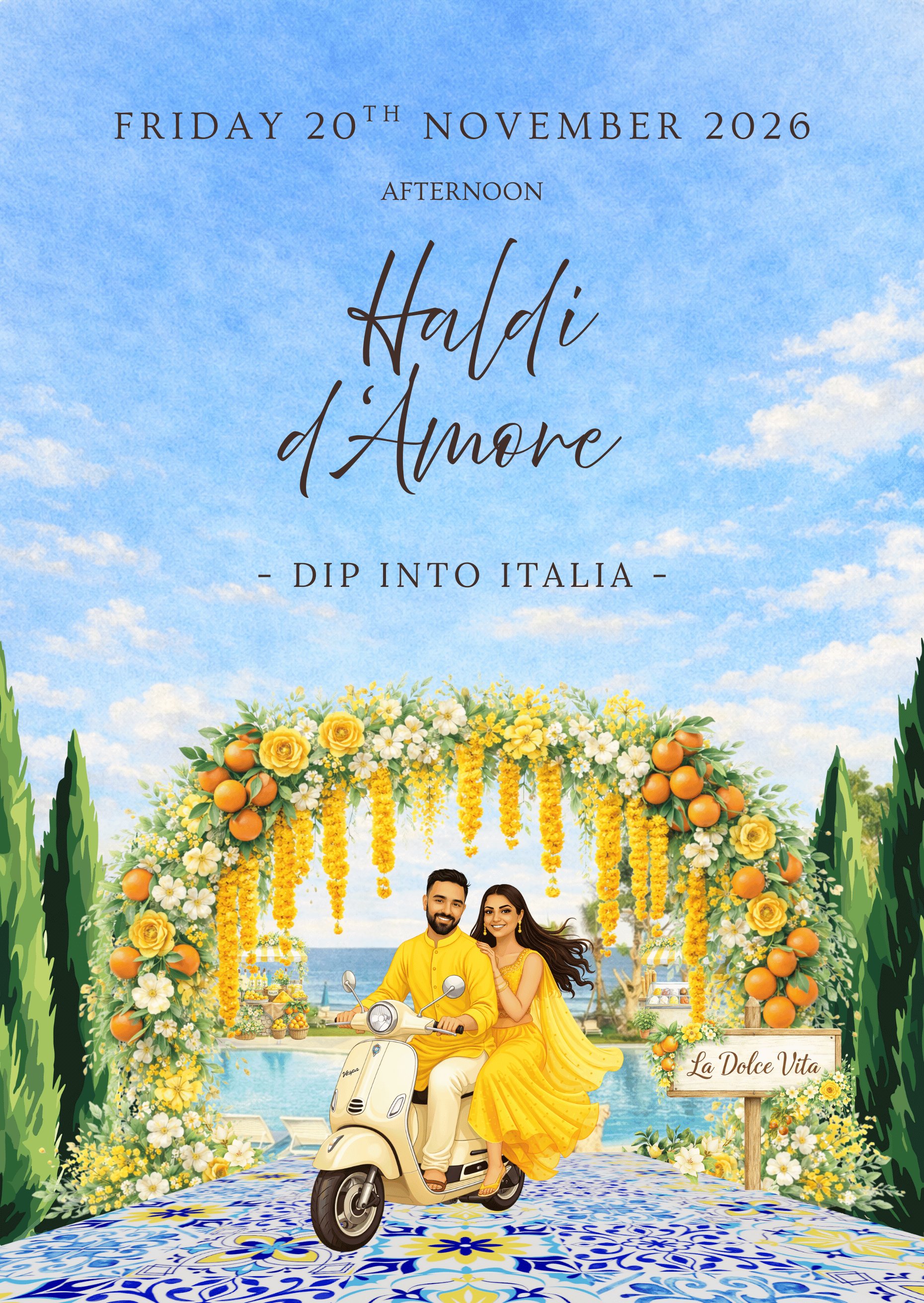 This event marks the joyful beginning of our wedding celebrations — a morning filled with turmeric, laughter, and love, shared with our closest family and friends. Inspired by the warmth and charm of the Italian coast, Haldi D’amore brings together tradition and Mediterranean flair through citrus hues, olive greens, soft florals, and relaxed coastal elegance. As the celebration unfolds, the energy turns playful with music, games, and a pool party — a true dip into Italia — where the sun shines, food flows, and the celebrations continue effortlessly.