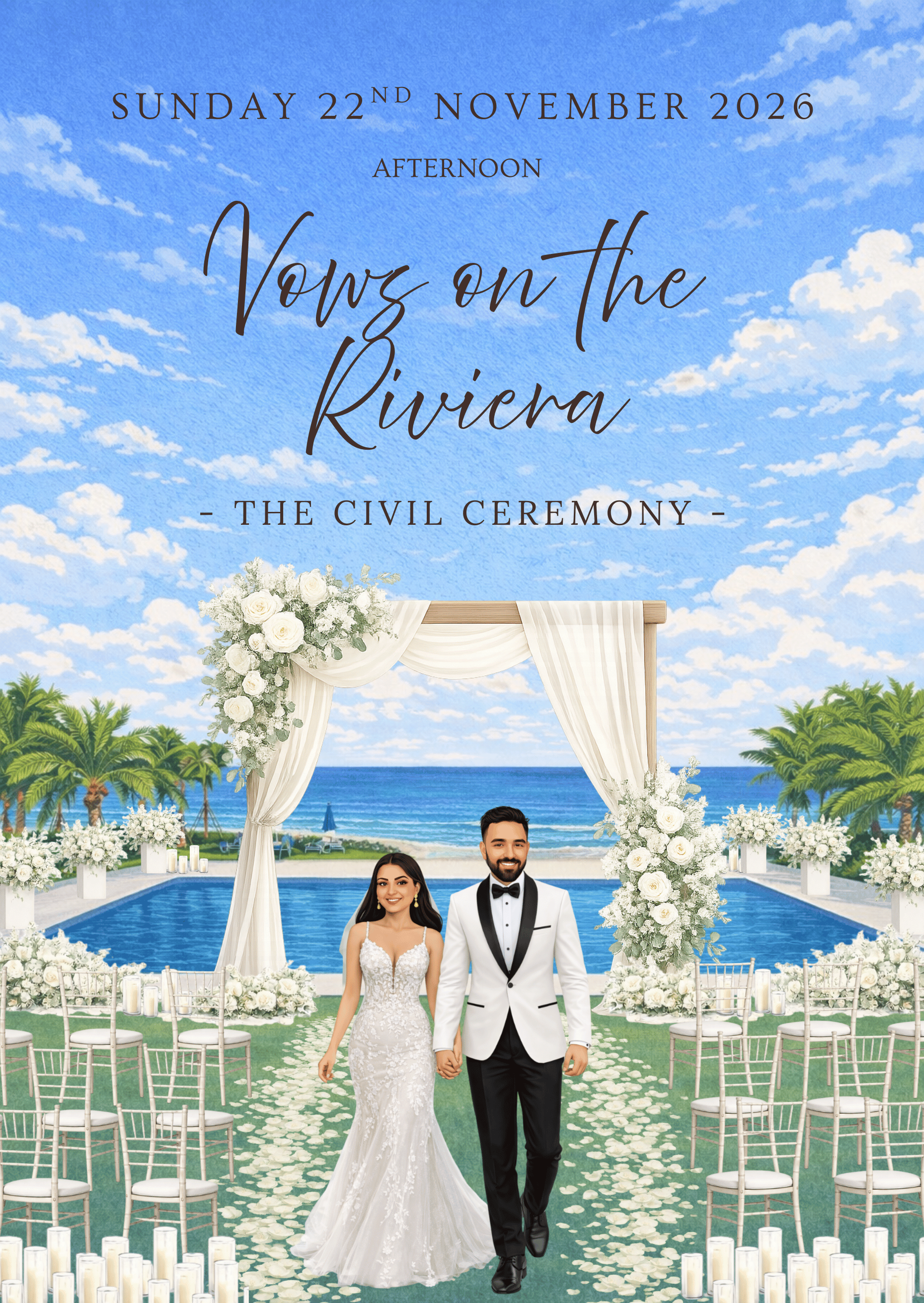This ceremony marks a quiet and meaningful moment within our wedding celebrations — an intimate civil union inspired by the elegance of the French Riviera in the South of France. Set against the serenity of the sea, we come together to exchange vows in a setting that feels timeless, composed, and deeply personal. Guided by simplicity and intention, this ceremony celebrates commitment in its purest form — a moment to honour love, partnership, and the promises we make to one another as we continue our journey together.