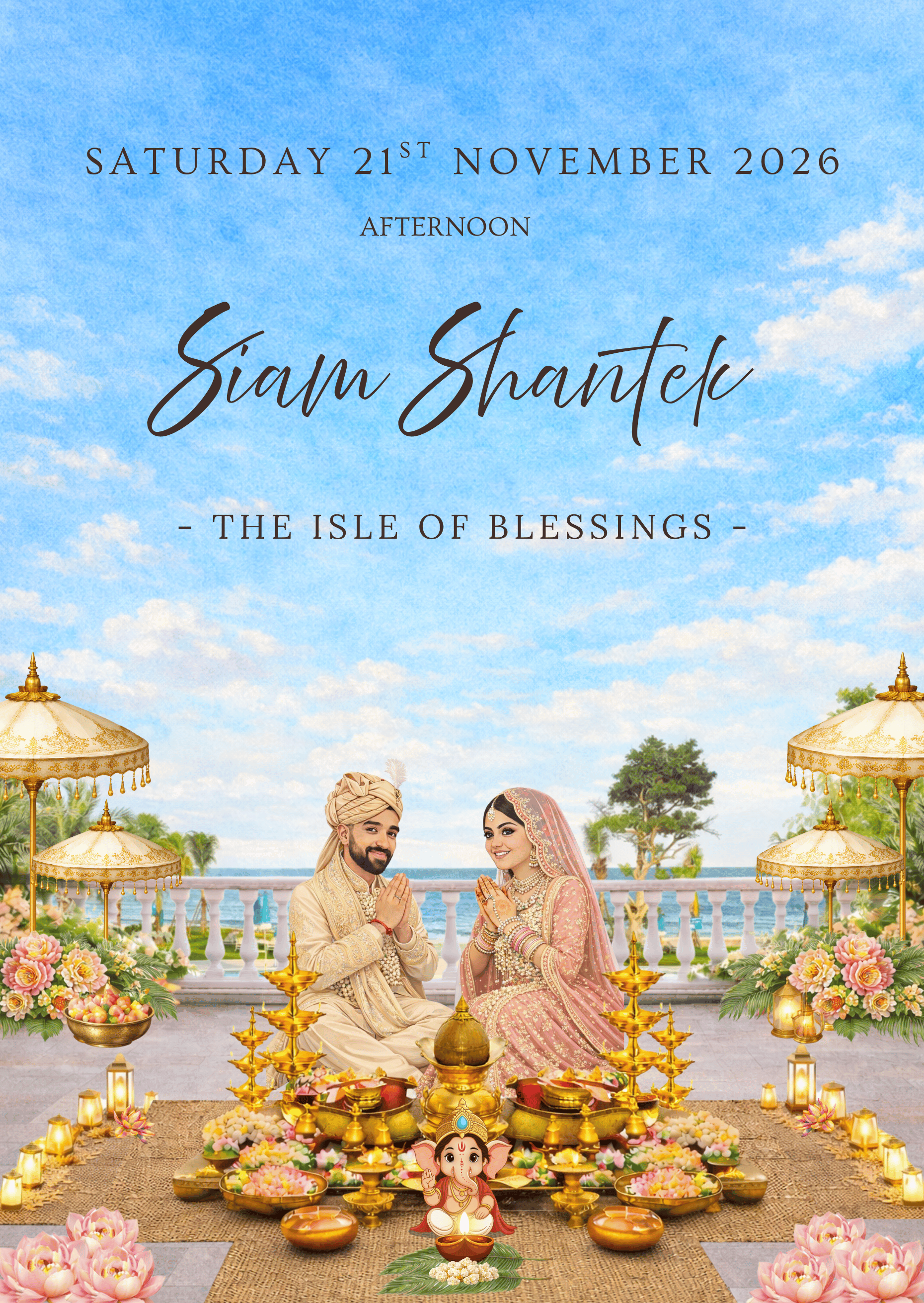 This ceremony marks a moment of calm and blessing within our wedding celebrations — a sacred gathering centred on harmony, protection, and gratitude shared with you. The Siam Shantek, also known as the Graha Shanti or Mandvo Pooja, prepares us to begin married life with intention and grace, inspired by the tranquillity of the Thai islands. Guided by meaningful rituals, including the Mameru/Mosaru, the atmosphere is infused with positive energy and quiet presence — truly an isle of blessings — offering a gentle pause before the celebrations continue.